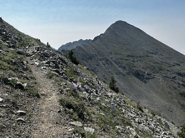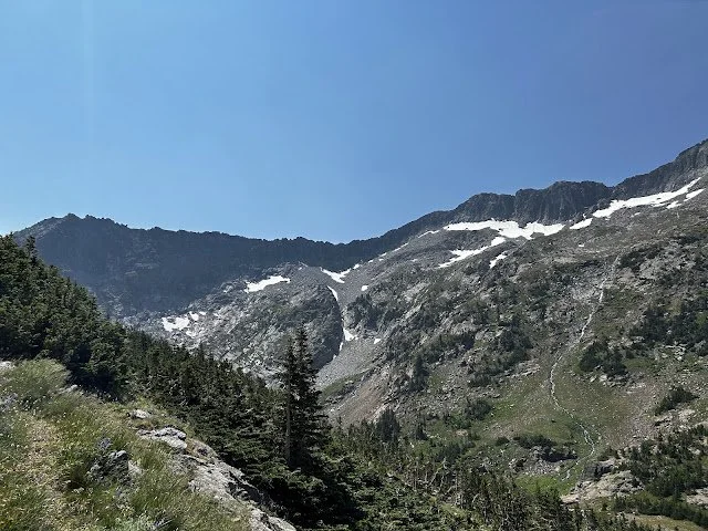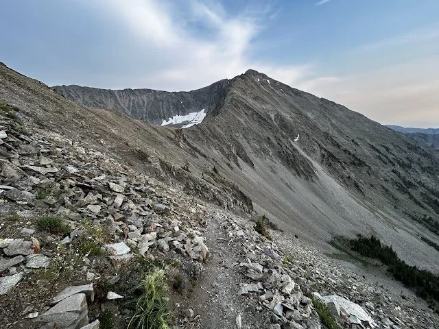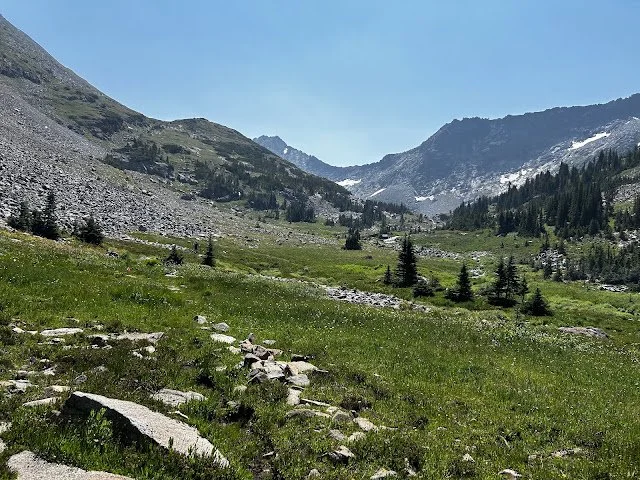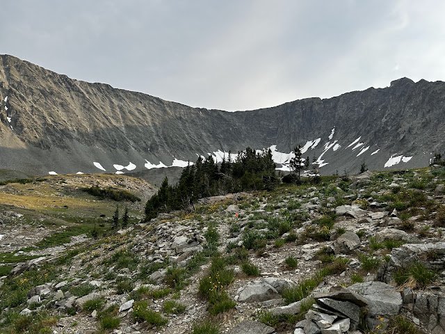 I was in 3rd at this point and about 50K into the race. The volunteers told me that I was about 5 minutes back from Seth and second place, Croom Beatty. I left in good spirits and caught up to Croom a few minutes after leaving the aid. Eventually the trail opened up to some grassy meadows with cairns. There was a water crossing where I tried to avoid getting my feet wet, but it was useless. I chatted with Croom briefly as he was dealing with some stomach issues and passed him as we made our way up our second climb of the day to Conical Peak all while Seth was a few switchbacks up above us. The trail got narrower and started climbing steeper up to another stunning lake called Glacier Lake through trees. This section is mostly exposed tundra but has some tree cover in areas. I saw a few folks with their horses camping as we ran by them. Then the trail becomes full of rocky switchbacks while continuing on up to the pass. I'm just soaking in what is the most breathtaking portion of the entire race.