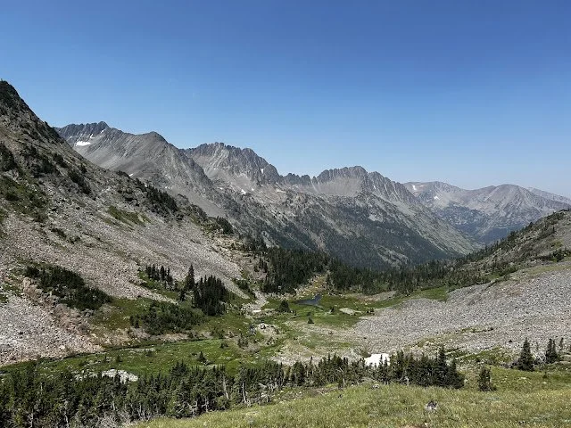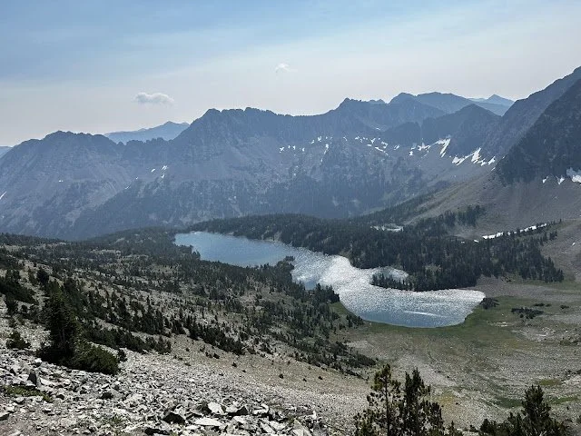 I could see Seth climbing in the distance and maintained my speed up the mountain. The ascent was around 2700 feet in 5 miles to the pass. Once out of tree cover, the valley opened up and getting the first glimpse of the canyon was unreal. There were also many water crossings and plenty of options for filtering down below the base of the pass. By the time I reached the summit, Anastasia, another race photographer was up there snapping photos. The view was incredible of Campfire Lake and then on the other side of the pass was views of Moose Lake which we'd descend down to before getting to Cow Camp, a remote aid station that horse's hike 8 miles in for the supplies. Shout out to the volunteers there!